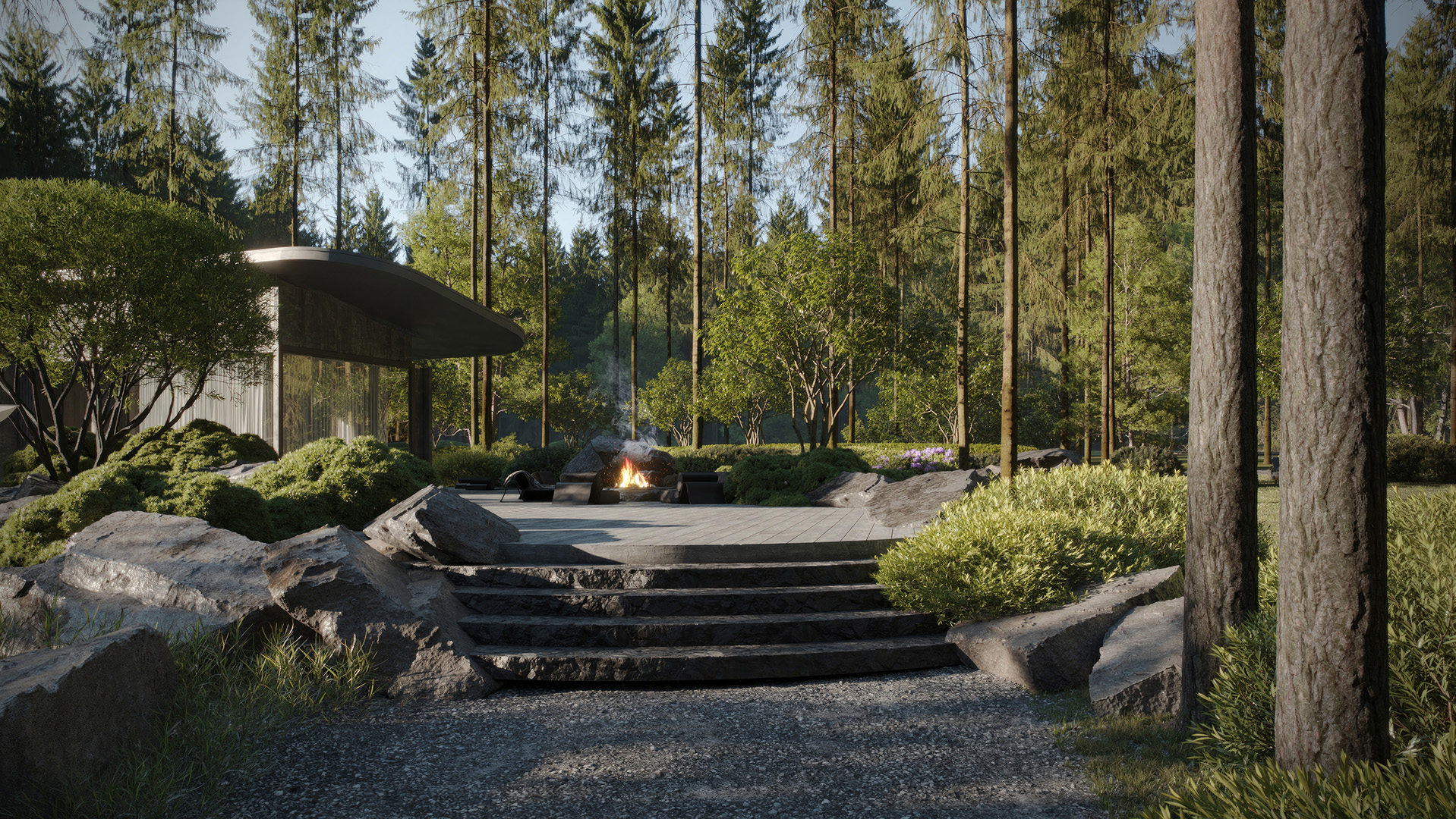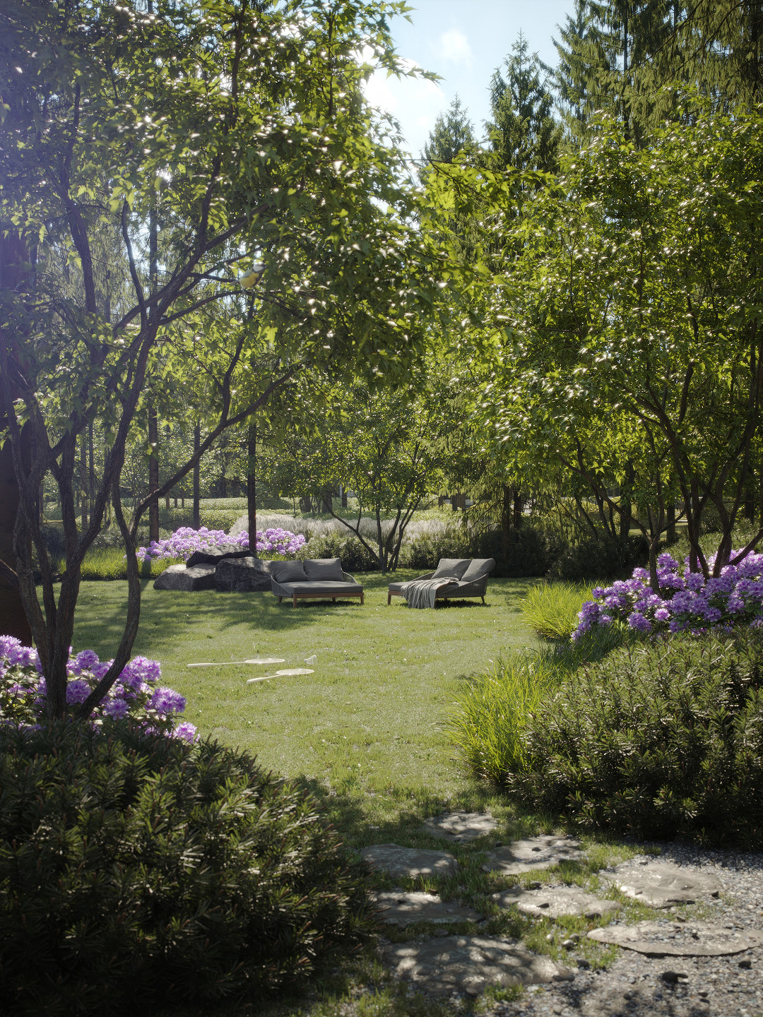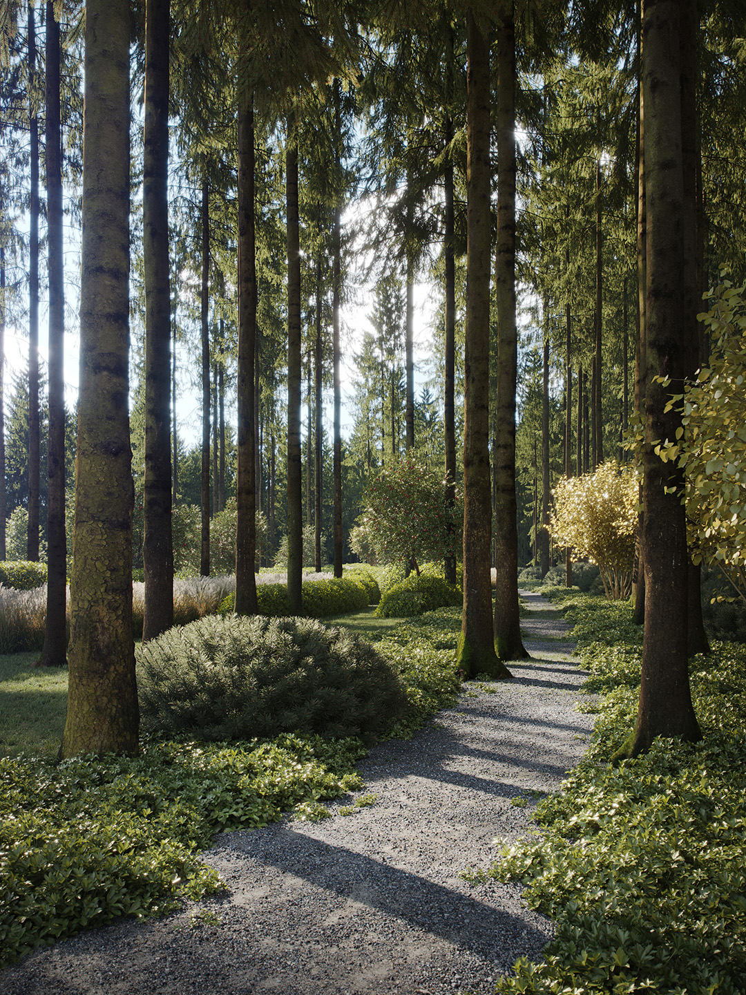 Изначально на участке уже обитали олени, поэтому мы решили развить тему живой природы и ее отражения в искусстве. Скульптуры животных рифмуются с живыми существами, создавая ощущение фантастичности. Природа и искусство поддерживают друг друга.