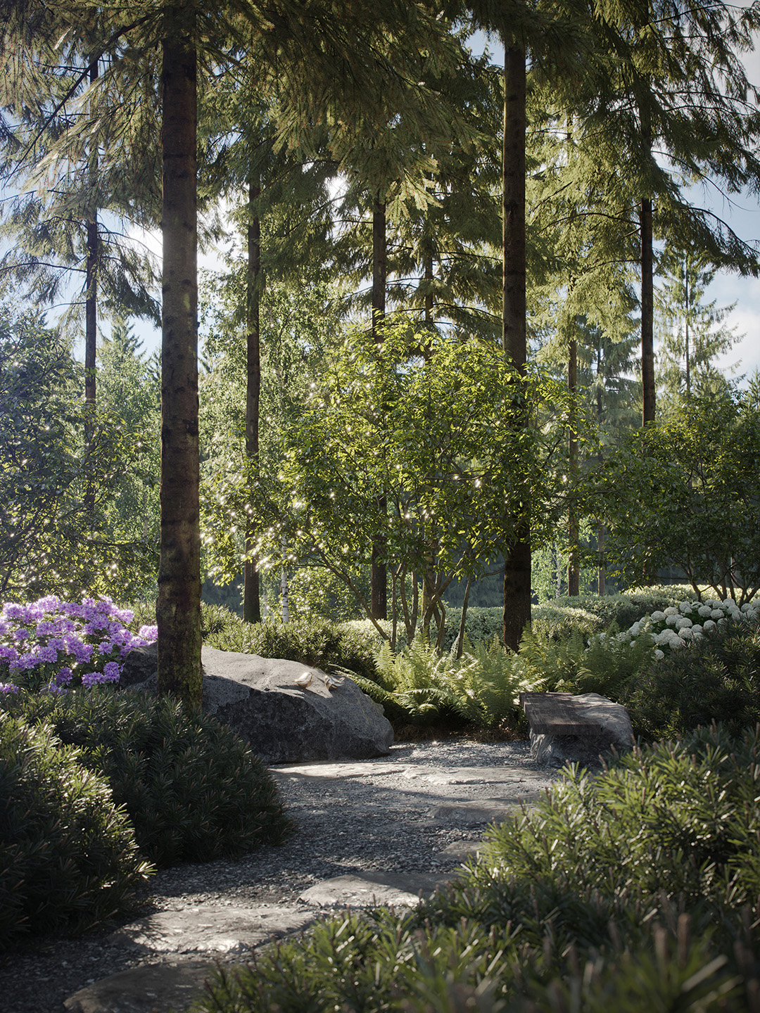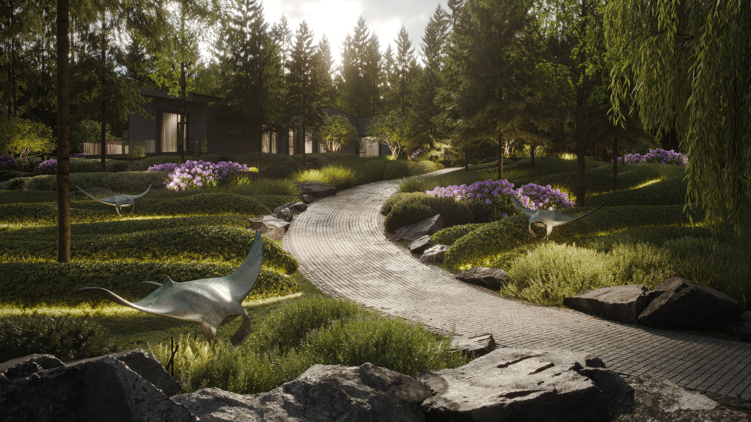 Ключевой пластический мотив — волнообразные линии. Они проходят через весь сад, проявляются в посадках, постройках, скульптурных композициях и даже в освещении.
